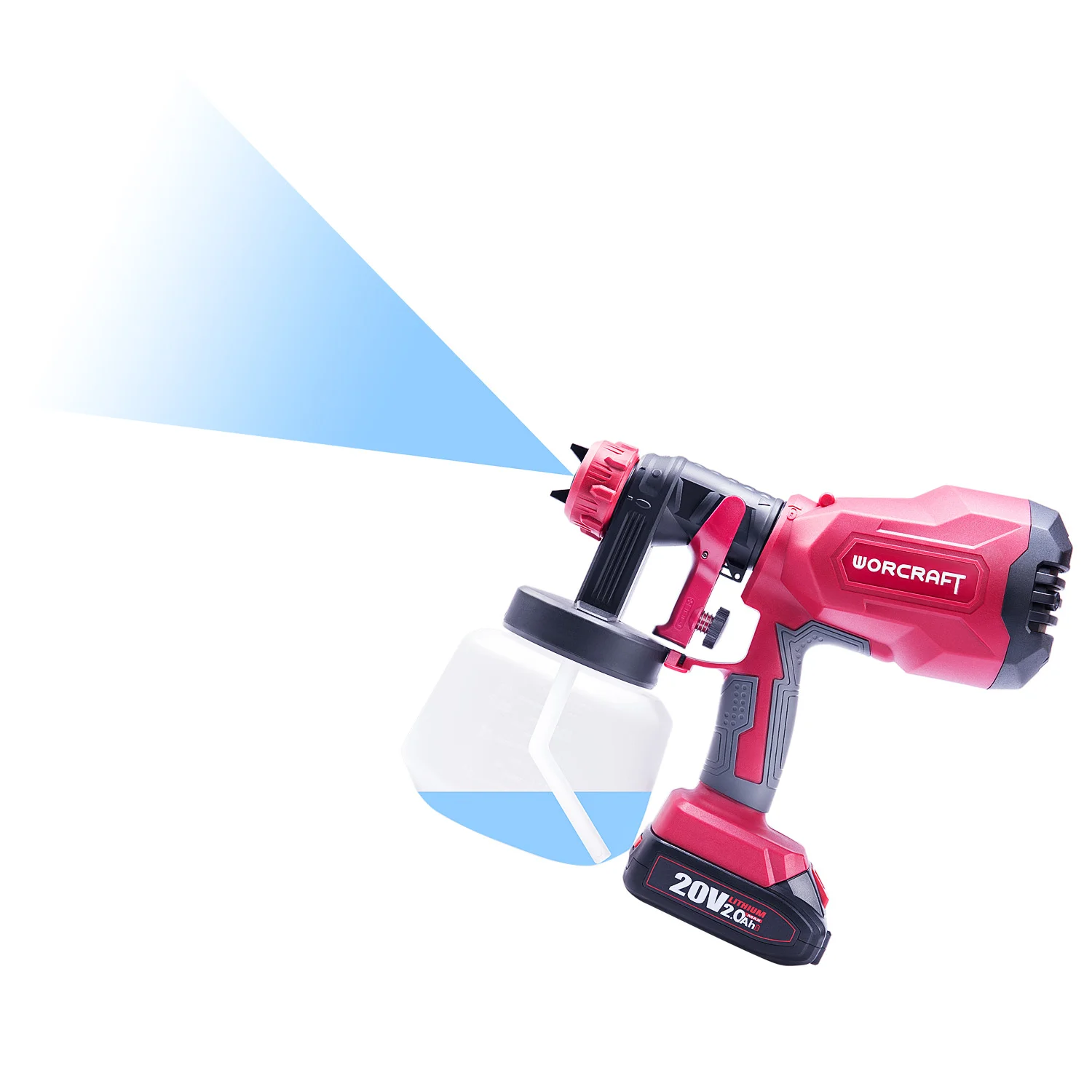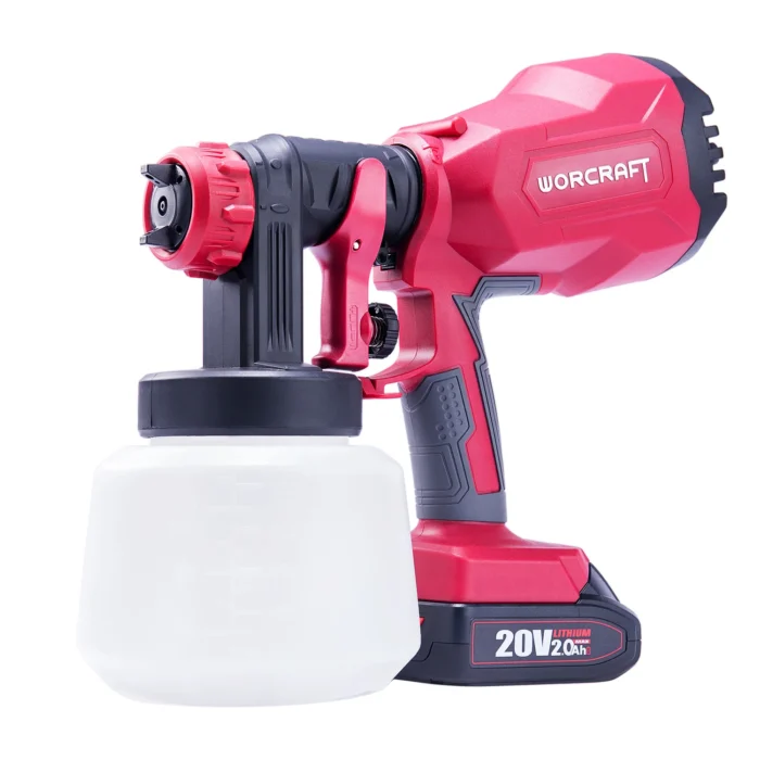 Pistol de vopsit fără fir Worcraft CSG-S20LiA – acumulator 20V, 700 ml/min, 2 duze, rezervor 1L, reglaj debit, fără compresor, ONE FOR ALL.