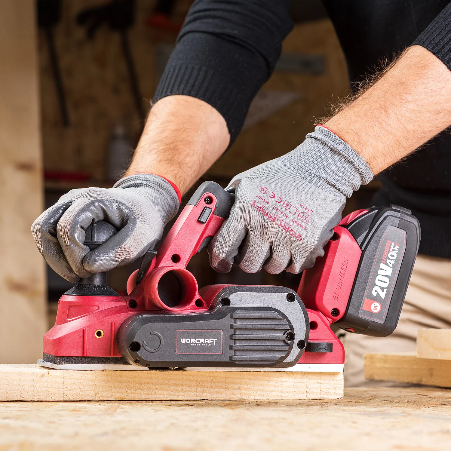 Rindea fără fir Worcraft CEP-S20LiB – motor brushless, 82 mm lățime, 2 mm adâncime, 15.000 rpm, acumulator 20V ONE FOR ALL, pentru rindeluire mobilă.