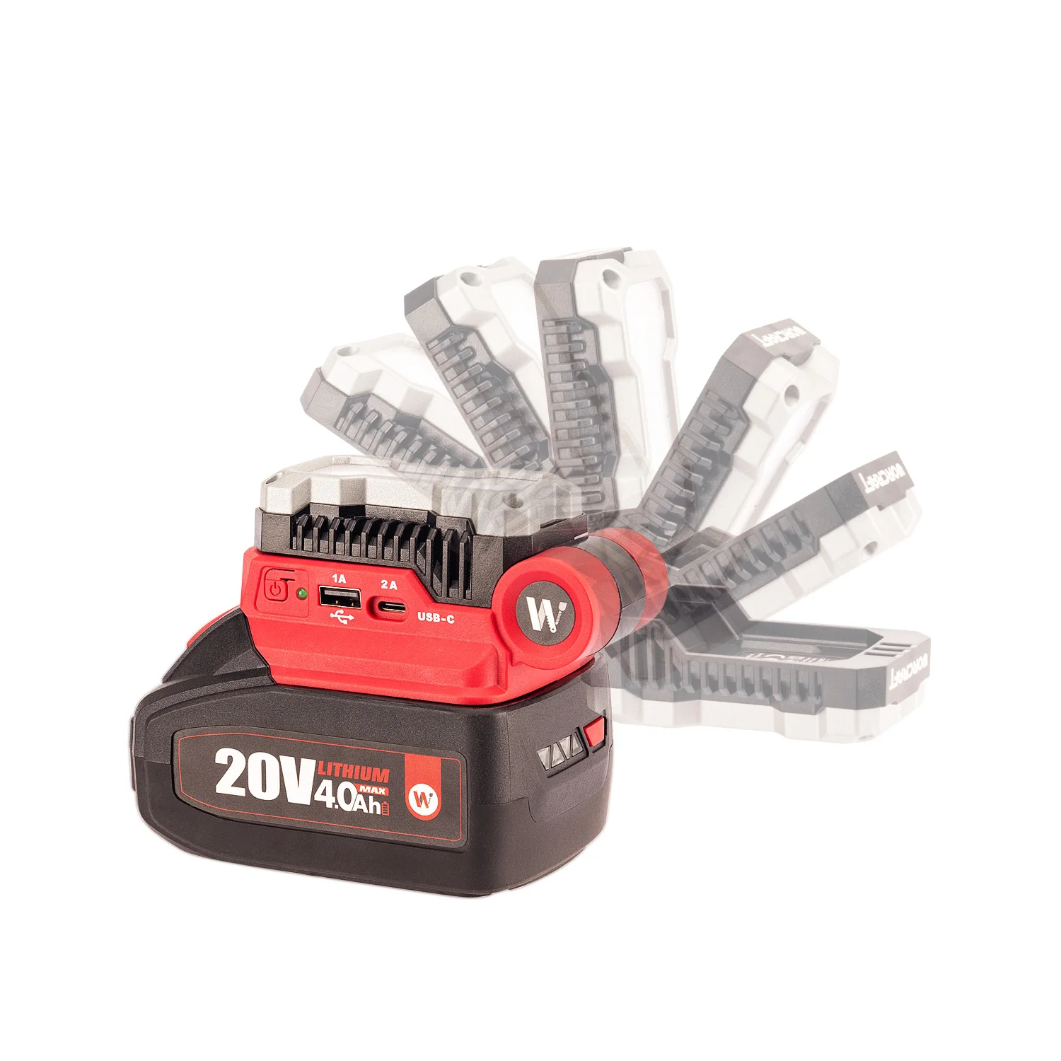 Adaptorul Worcraft CUA-S20Li transformă orice baterie ONE FOR ALL într-o sursă mobilă de energie și lumină, esențială pentru profesioniști și pasionați de bricolaj.