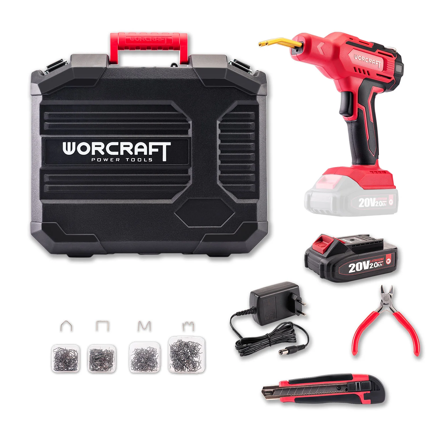 Pistol de lipit plastic Worcraft CPW-S20Li – 500°C în 3 secunde, acumulator 20V, set agrafe și accesorii, pentru reparare bare auto, spoilere și piese plastic.