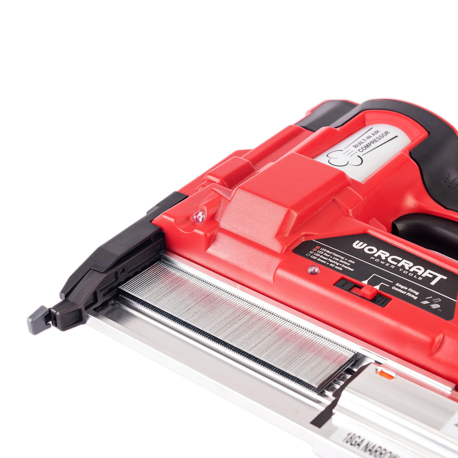 Worcraft CNS-S20LiH este un pistol de cuie (nailer/stapler) pe acumulator 20V ONE FOR ALL care bate cuie și scoabe fără compresor, fără furtun de aer și fără fir. Ritmul de lucru ajunge la 100 de fixări pe minut, cu două moduri de operare: foc singular (precizie) și foc continuu (viteză).